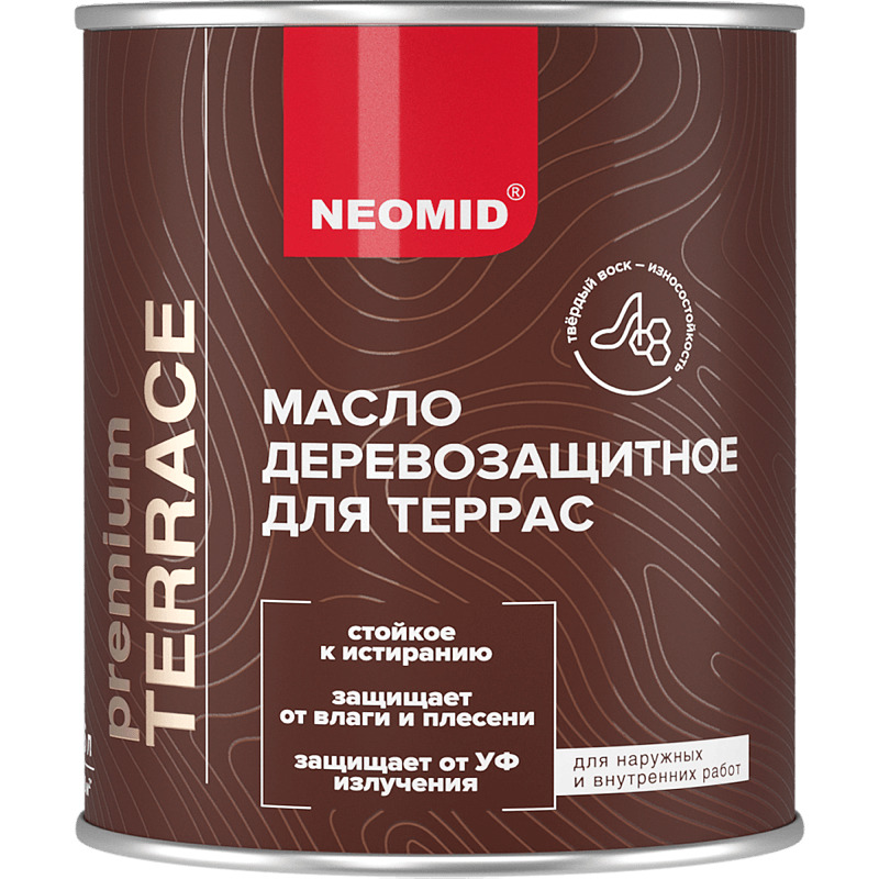 Масло деревозащитное для террас NEOMID PREMIUM TERRACE – профессиональное масло для защиты и декоративной отделки деревянных поверхностей. Предназначено для обработки как новых, так и ранее обработанных маслом или антисептиками деревянных поверхностей, включая террасы, веранды, лестницы, настилы, полы (массивная доска, паркетная доска, паркет, пробковый пол), мебель, стены, окна, двери, деревянные фасады, беседки, заборы и садовую мебель.