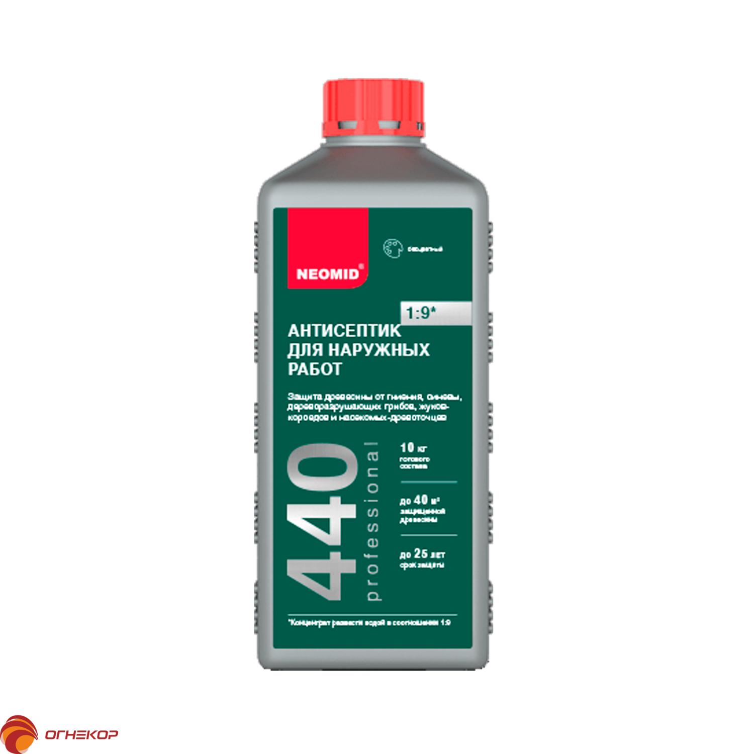 NEOMID 440 — профессиональный антисептик для древесины, предназначенный для наружных и внутренних работ. Концентрат 1:9 обеспечивает долговременную защиту деревянных конструкций от гниения, плесени, синевы, насекомцев-древоточцев, а при применении с пленкообразующими покрытиями срок службы древесины достигает 25 лет.