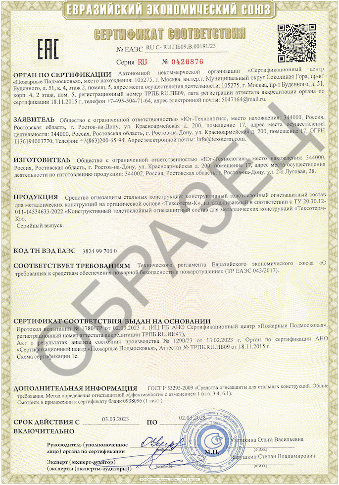 «Тексотерм-К» ТУ 20.30.12-011-14534633-2022 – это высокоэффективный огнезащитный состав для металла, разработанный для конструктивной огнезащиты металлоконструкций на промышленных, гражданских и общественных объектах. Состав обеспечивает долговременную защиту от высоких температур, повышает предел огнестойкости металла на 90, 120 и 150 минут и подходит даже для тонколистового металла толщиной менее 5,8 мм.