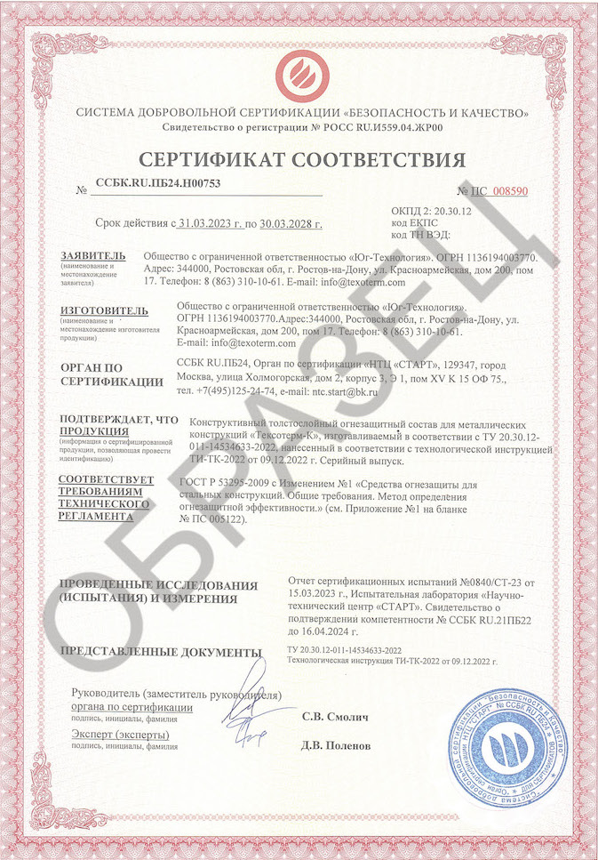 - Длительный срок службы огнезащитного состава Тексотерм-К – до 25 лет в помещениях и до 15 лет на открытом воздухе