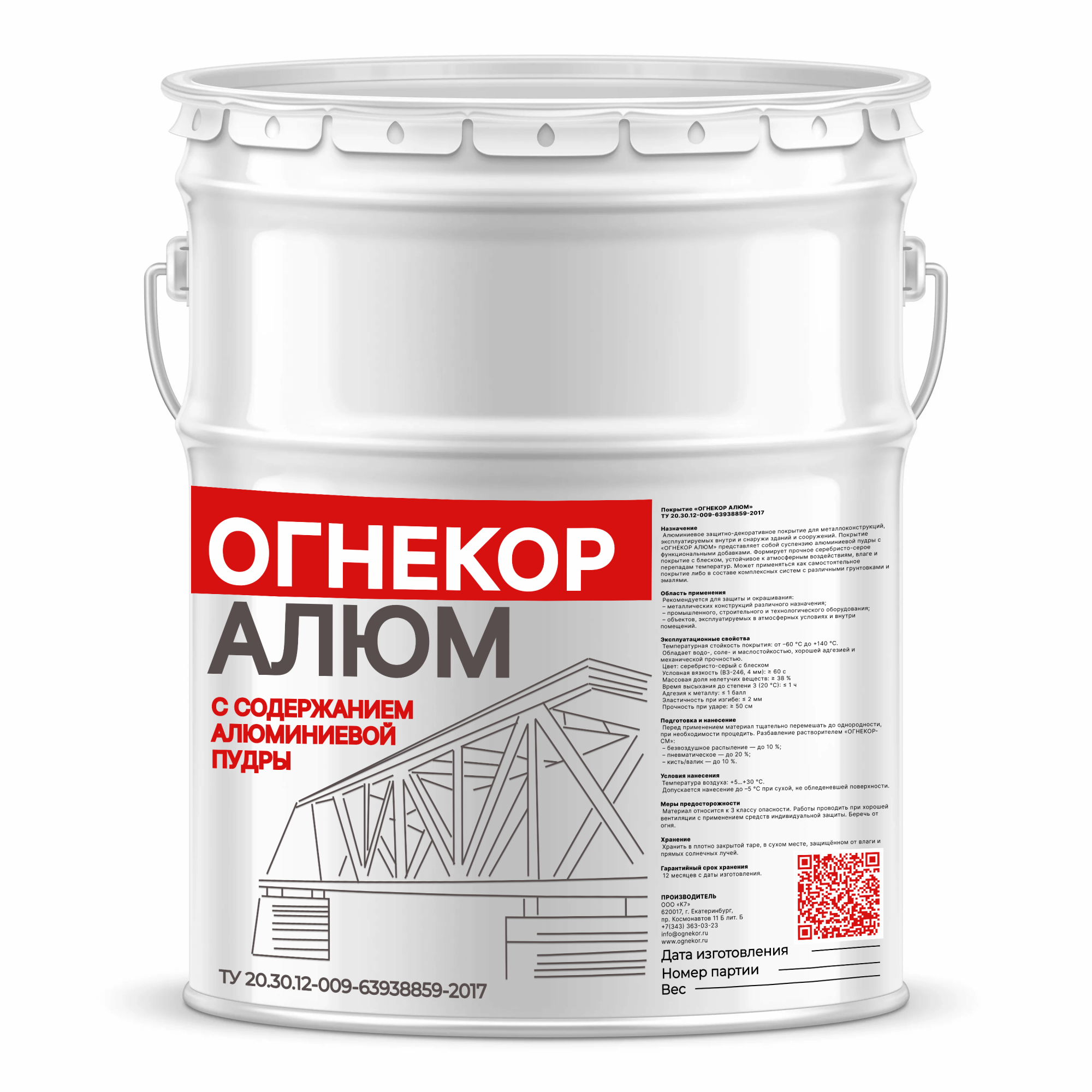 Покрытие «ОГНЕКОР АЛЮМ» — суспензия высокодисперсной алюминиевой пудры с функциональными добавками, предназначенная для защиты металлических, бетонных и железобетонных конструкций от коррозии и атмосферного воздействия. Формирует ровное серебристо-серое покрытие с металлизированным блеском, стойкое к температурным перепадам от -60°С до +140°С и механическим, химическим нагрузкам.